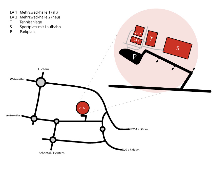 Beide Hallen befinden sich in unmittelbarer Nähe zueinandner und bilden mit der Gesamtschule von Langerwehe das Schul- und Sportzentrum. Direkt vor den Hallen befindet sich ein großer Parkplatz, der ausreichend Platz für Spieler und Zuschauer bietet.